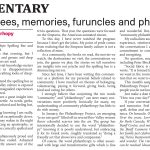 “What happened?” I ask. They look at each other and somebody holds out a swollen fist with scraped knuckles. The rest of this story is not mine to tell, but at some point, I learn that the word ‘suckerpunch’, means someone gets punched by surprise, a blow that arrives from out of the blue.