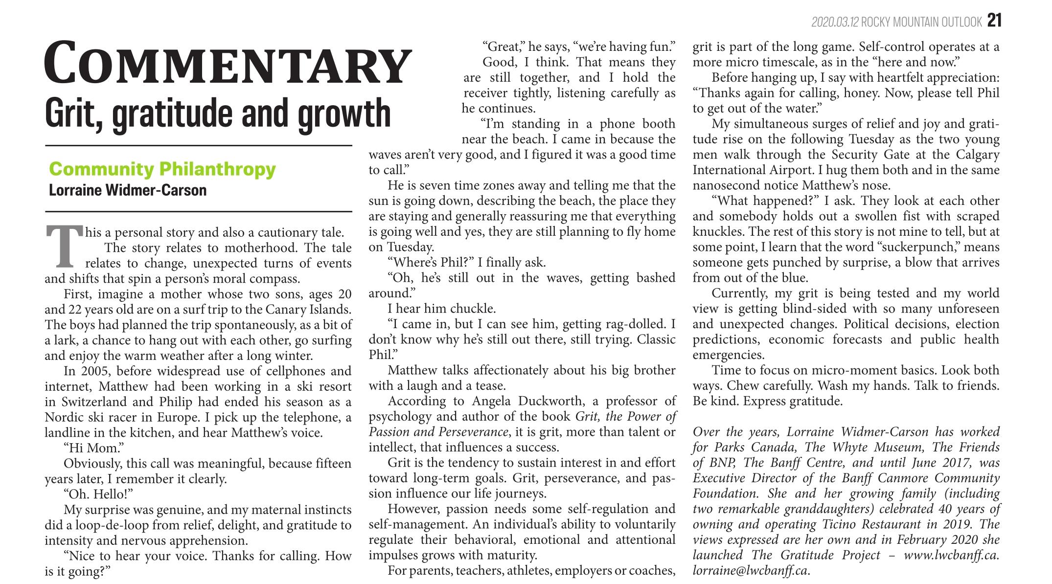 Grit, Gratitude and Growing – as published in Rocky Mountain Outlook, March 12, 2020